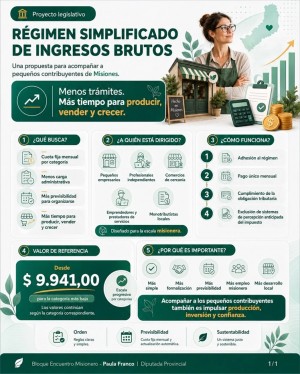 El proyecto presentado la diputada Paula Franco junto al bloque Encuentro Misionero propone un régimen simplificado de Ingresos Brutos: pago único mensual por categoría, menos trámites y más previsibilidad para quienes producen, con el objetivo de impulsar la formalización, fortalecer el cumplimiento y dinamizar el desarrollo local. La diputada provincial Paula Franco presentó un proyecto de ley, con respaldo del bloque Encuentro Misionero, para la creación del Régimen Simplificado del Impuesto sobre los Ingresos Brutos. Esta iniciativa está destinada a los pequeños contribuyentes y plantea reemplazar el esquema actual de declaraciones y percepciones por un sistema de cuota fija mensual por categoría. “En Misiones creemos en un Estado que ordena y acompaña al que produce”, expresó la legisladora en sus redes sociales. Además, subrayó que la iniciativa apunta a un esquema más claro y accesible: “Este proyecto va en esa línea: pago único mensual, reglas claras y previsibilidad para el contribuyente chico. Menos energía puesta en gestiones, más foco en trabajar, invertir y crecer”, señaló. Según explicó, “al ordenar el sistema con un esquema simple, se fortalece el cumplimiento, se impulsa la formalización y se construye confianza: la base para más actividad, más empleo misionero y más desarrollo local”. La propuesta cuenta también con las firmas del presidente de la Cámara de Representantes de Misiones, Sebastián Macías, junto a los diputados Carlos Rovira y Alejandro Arnhold. El régimen tiene como objetivo simplificar el cumplimiento de las obligaciones fiscales -tanto materiales como formales- mediante el pago de una cuota fija mensual por categoría. Además, contempla una regularización anual en los términos que establezca la ley. Podrán adherirse las personas humanas y otros sujetos que reúnan la condición de pequeños contribuyentes conforme al Régimen Simplificado para Pequeños Contribuyentes (Monotributo), incluyendo sus variantes como el Monotributo Social y el Monotributo Promovido, o los sistemas que los sustituyan en el futuro. También deberán estar inscriptos en el Impuesto sobre los Ingresos Brutos en Misiones y desarrollar su actividad exclusivamente en jurisdicción provincial, quedando excluidos quienes tributen bajo el Convenio Multilateral. El proyecto establece exclusiones para los sujetos alcanzados por dicho convenio, así como para quienes desarrollen actividades u operaciones que la autoridad de aplicación considere incompatibles por su naturaleza, riesgo fiscal o modalidad de comercialización. De la misma manera, quedarán fuera quienes registren sanciones o inconsistencias que ameriten su exclusión. Cuota fija mensual y regularización anual En cuanto a la determinación del impuesto, los contribuyentes adheridos deberán abonar una cuota fija mensual según la categoría en la que se encuadren en el régimen nacional. Esta cuota tendrá carácter de anticipo íntegro de la obligación anual, que se integrará mediante doce pagos mensuales por cada ejercicio fiscal. La autoridad de aplicación establecerá un vencimiento único mensual para el pago. |
